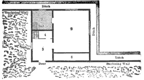 Here is the ground plan of the pavilion. It had a ground-floor which was reached by a few steps, and above it was an attic, with which we need not concern ourselves. The plan of the ground-floor only, sketched roughly, is what I here submit to the reader.