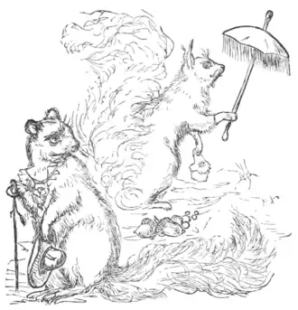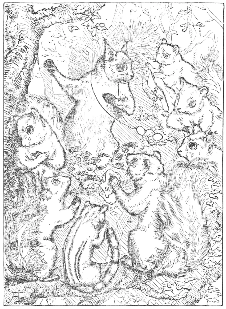 "A fashionable belle of the first water was Nippie,—slender, graceful, bewitching,—with a most beautiful long tail, which she put up in hot pine-needles every night, and fluffed out in the morning till it stood like a glory round her head when she waved it. And this she did very often, especially when desirable bachelor squirrels were about. All the Nutcrackers were beside themselves with pride over the possession of this lovely creature. Distinguished suitors came from far and near, bringing such gifts of beech-nuts, acorns, and toothsome walnut-meats all picked out of the shells, that Nippie's bower used to look like a provision-market. But to none of her lovers did she give any encouragement; for her secret heart was set upon King Nutcracker, the chief of her tribe.