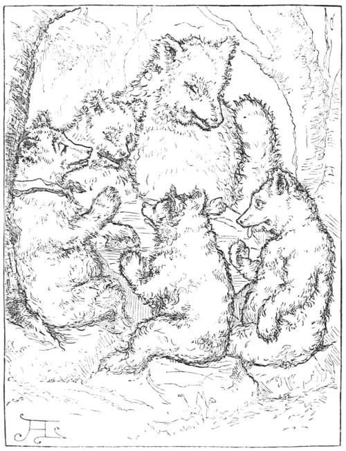 "They used to lie all curled up in a heap," continued February, "at the bottom of a nest in the rocks, which their mother had lined with leaves and moss to keep them warm. They looked just like funny bundles of brown hair. There were four of them,—Snap, Snooze, Roll-about, and Greedy. Roll-about was the fattest and the best-natured, but they were all nice. They lay tangled together, and couldn't help pulling each other's fur a good deal; but they quarrelled much less than most brothers and sisters who live in such close quarters.