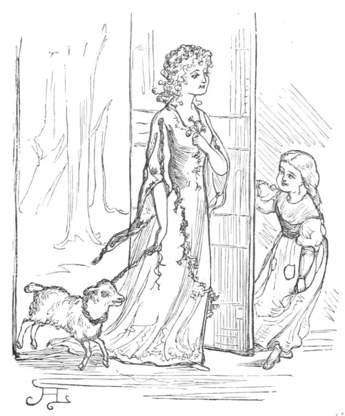 There was no languor or dulness this time. The hearth was cleanly swept, and the door left ajar that the guest might see the light as she walked through the Forest. But so quiet was her coming, that her hand was on the latch before they knew it, and both of them jumped at the sound of her knock. As she came in, they saw that a lamb was trotting beside her, held by a band of young spring grasses, curiously woven together.