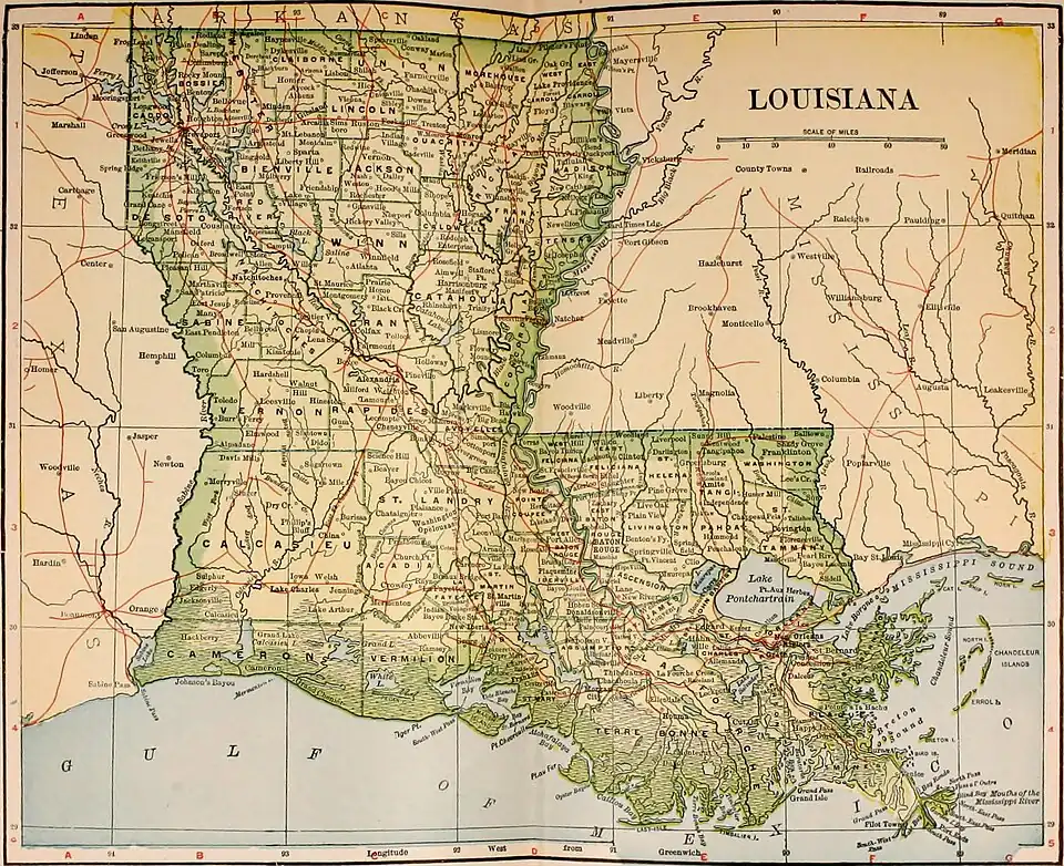 LOUISIANA, lo͞o-ē′zē̇-ä′nȧ or -ăn′ȧ (named as a colony in honor of Louis XIV. of France). One of the Gulf States of the American Union. It is on the lower course of the Mississippi River, and includes the great delta within its limits. It lies between the parallels of 29° and 33° N. latitude; it extends on the east to longitude 89° W. and its westernmost part lies just beyond longitude 94° W. It is bounded on the north by the State of Arkansas. Its eastern boundary is mainly Mississippi, following the Mississippi River to latitude 31° N., running east on this parallel to Pearl River, which it follows to its mouth in Lake Borgne; farther south it has the Gulf of Mexico on the east. The Gulf washes its entire southern margin, and Texas bounds it on the west. The western boundary follows Sabine Lake and River to latitude 32° N., thence it extends due north to latitude 33°. The State has an area of 48,720 square miles, of which 3300 square miles is water. Of the water area 1700 square miles is made up of inland lakes, 1060 square miles of land-locked bays, often called lakes, and 540 square miles of river surface.