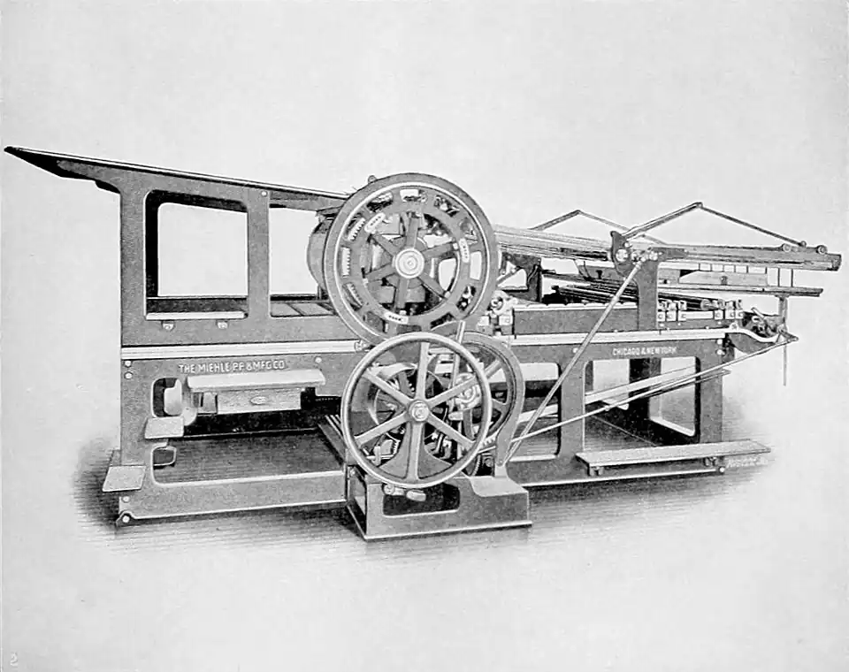 Printing Presses. The earliest engraving of a printing press shows a stout framework of wood posts, firmly braced against the ceiling to resist upward pressure, a bed plate of stone as a rest for the form of type, which could be exposed to receive ink, and then be slid upon ways under the platen or pressing surface. Impression was given by a large screw of wood over this platen and this screw was moved by a long bar of wood and iron. The sheet of paper to be printed (about 16×20 inches was a common size) was laid upon an inclined framework of wood covered with blanket or parchment, which was hinged to slide on the ways and to be placed under the platen. This platen impressed only one-half of one side of the paper; to print the sheet 16×20 on both sides the pressman had to give four pulls on the bar. To print with uniform margin and in accurate register, the sheet on its first impression was pierced with small perforations on the front side, and afterwards suspended from holes so made on properly placed points when the second side was printed. Although the mechanism of the press was rude and even petty, good printing was done upon it by a competent pressman. The first improvement in construction was made by Blaew, of Amsterdam, in 1601, who in addition to other devices attached springs to the platen moved by the screw, so that it could have a quick return movement without special exertion from the pressman. In 1786 M. Pierres, of Paris, invented a printing press entirely of iron, and strong enough to print one side of the sheet by one pull of the bar, but it did not meet with favor. About 1804, Earl Stanhope, of London, made great improvements on the large iron press of Pierres, adding many clever devices of his own for the lightening of labor. In 1806 Koenig, of Saxony, went to London with the model of an improved platen press, which he failed to introduce. His associates were more successful in reviving a patent issued to William Nicholson, of London, in 1790 for printing on a flat surface with cylindrical pressure. The new method was fairly tested upon a book form in 1811 and the new machine began to do the regular edition of the London Times in 1814. Soon after this all 30 daily newspapers had cylinder presses, for their greater speed and economy were advantages not to be neglected, but book work of all kinds continued to be done on platen presses of new construction. The Columbian Press, invented by George Clymer, of Philadelphia (1816); the Adams Power Press, made in 1830, by Isaac Adams, of Boston; the Washington Press, of Rust, of New York, in 1827, were for many years the favorites.