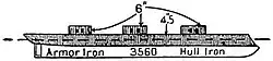 carried from 4.5 to 6.75 inches. The keel was not laid until 1854, only two months before the commencement of the ‘Kinburn batteries’ in France, but it is to be noted that the French vessels were floating batteries and not high-speed sea-going ships, as was Stevens's. The latter, whose construction, after the death of R. L. Stevens (1856), was continued by his brother, E. A. Stevens, was never completed, and the French were the first to produce a sea-going armorclad, the Gloire (for description see Armor Plate), which was a screw line-of-battle ship rebuilt in 1858-59 and armored; they also commenced the first iron-hulled armorclad (the Couronne) . The Gloire and Couronne were quickly followed by the Warrior, which was laid down in England in 1859. In 1860 the Italians ordered the armored frigates Terribile and Formidabile in France; and in the latter part of 1861 the Russians changed the plans of the wooden frigate Petropavlovsk, then building, and gave her a complete water-line belt and casement of iron. So far the application of armor to vessels had brought about no change in the type except to reduce the number of decks on which guns were carried. But in 1861 the Monitor and Merrimac (Virginia) were designed. They differed from all previous men-of-war in being mastless; each was completely armored: one mounted its guns in a revolving turret and one in a central armored battery. If you place a monitor's turret at each end of the Merrimac's citadel, make the sides more nearly vertical, and raise the upper deck sufficiently to give seaworthiness, you have the general features of the battleship of 1903.