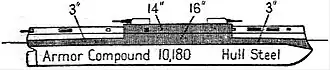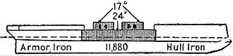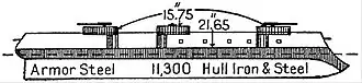 In 1861, under an act of Congress providing for armored vessels, the Galena, the New Ironsides, and the Monitor were constructed. The Galena was an armored gunboat of the ordinary type, except that her sides amidships inclined inward (‘tumbled home’) at an angle of about 45 degrees and were covered with 2.5 inches of armor. Her plating was found to be too thin to be of much use and she was regarded as a failure. She was completed early in 1862 and took part in the attack on Drewry's Bluff forts, when her armor was repeatedly perforated. In this case, since the forts were elevated, the inclination of her sides was a disadvantage. The New Ironsides was finished late in 1862 and attached to the blockading fleet off Charleston, where she remained for two years. She was built of wood and her general plans were similar to those of an ordinary steam frigate of her day, except that she had a ram bow and a retreating stern like that of many recent battleships. Her sides ‘tumbled home’ at an angle of about 30 degrees from the vertical for about two-thirds her length, and over this portion she was covered by 4.5-inch iron plates of large size from some distance below the water line to the upper deck. The broadside armor was joined at the ends by thwartship plating of equal thickness, the whole forming a citadel protecting the battery, boilers, and engines. She was 232 feet long, 58 feet broad, and had a displacement of 4120 tons at her designed load draught. Her battery consisted of sixteen 11-inch Dahlgren smooth-bores, two 220-pounder Parrot rifles, and four 24-pounder howitzers. She was the most successful armored ship of her day, was in action more times than any other vessel ever built (so far as existing records show) and was struck by more projectiles than any other vessel, yet her armor was never pierced, she was never put out of action, and she was never forced to go to a home port or depend upon outside assistance, while in some of the actions in which she was engaged other ironclads were sunk and several monitors were disabled and forced out of action. After the war, in 1866, she was accidentally destroyed by fire at the Philadelphia navy yard.