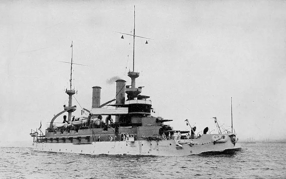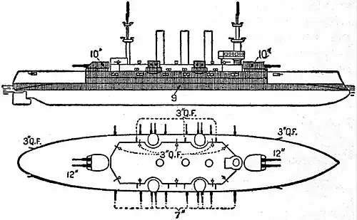 In the United States no armored vessels except monitors were built until the small battleships Maine and Texas were begun in 1889. About two years later the larger battleships Indiana, Massachusetts, and Oregon of 10,280 tons were commenced. A prejudice still existed against ‘high-sided’ armorclads, and these were designated as ‘coast-line battleships’ and given very moderate freeboard. They were very remarkable ships for their day. Their speed was rather low than high—but the battery was powerful and included, in addition to four 13-inch guns, a powerful auxiliary battery of eight 8-inch and four 6-inch guns. The possession of 8-inch guns makes them still formidable foes for the most recent European battleships, for shells from these guns will at battle range pierce the armor protecting any auxiliary battery afloat. Two years later juster ideas of the true uses of a naval force permitted the building of the Iowa (11,340 tons), which was frankly called a ‘sea-going battleship.’ She was followed by the Kentucky and Kearsarge of 11,525 tons. These vessels embodied many new ideas, the most talked of being the superposed turrets of the 8-inch guns, which were placed on top of the turrets of the 13-inch. The second peculiarity is the arrangement of the guns in a long central battery (but separated by 1.5-inch steel screens) behind continuous armor; the side amidships is thus completely armored. The third point of interest is the wide application of electricity—every piece of auxiliary machinery outside the engine and fire rooms being driven by electric motors. In the next ships, the Alabama, Illinois, and Wisconsin (11,525 tons—completed 1901), and the Maine, Missouri, and Ohio (12,500 tons, completed in 1902-03), the 8-inch guns were omitted, following the European practice. This mistake was corrected in the next five ships, the Georgia, New Jersey, Nebraska, Virginia, and Rhode Island (15,000 tons, commenced in 1901), which have superposed 8-inch turrets over the 12-inch guns and another pair of 8-inch guns in a turret on each side amidships; in addition, a battery of twelve 6-inch guns is provided. In the next two ships, commenced about the end of 1902, the Connecticut and Louisiana (16,000 tons), the 8-inch guns were retained, but arranged over the central superstructure, nearly as in the Oregon; the four 12-inch guns are mounted as in all recent American battleships; and in addition to the 8-inch, there is an auxiliary battery of twelve 7-inch guns. These ships are much the most strongly armed ships so far designed for any navy.
