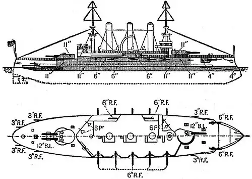 We have so far considered battleships only. Many ships are more lightly armed and armored, but are given high speed and a large coal supply. These are called armored cruisers. At first, armored cruisers were rather small, and the armor confined chiefly to a belt at the water line. While older vessels, designed as battleships, partake of the character of cruisers, the first armored cruisers designed as such were the Imperieuse and Warspite, of the British navy. They were completed in 1886-88, but were designed about 1881. The armor consists of a short water-line belt and shallow barbettes for the four principal guns. The first innovation was the French Dupuy de Lôme, commenced in 1888 and finished about 1892. With the exception of a small area at the bow her sides are completely covered with 4-inch armor from the water line to the upper deck, and, in addition, she has armored barbettes for her principal guns. She was followed by other French ships almost equally covered—the armor a little thinner—but later types in all navies have much less area of side covered. In order to provide adequate sustained speed in heavy seas and to carry large supplies of coal, armor, and armament, the size of armored cruisers has grown until now many of them exceed 14,000 tons in displacement and approach the most powerful battleship in armament and protection. Such, for instance, are the Tennessee and Washington of the United States Navy, which were commenced about the end of 1902. They are 502 feet long, and have a displacement of 14,500 tons, while their battery consists of four 10-inch guns, sixteen 6-inch, twenty-two 3-inch, twelve 3-pounders, four 1-pounders, and eight automatic and machine guns.