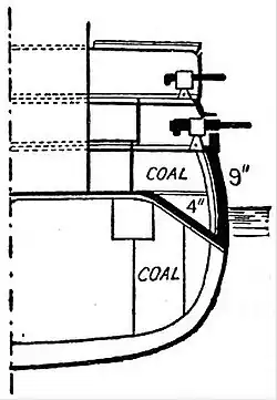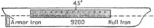 As regards belt armor, the vessels of the Oregon class have water-line belts extending for little over half the length amidships; the Iowa’s belt is proportionately much longer; in the Kearsarge and Alabama classes the belt is extended to the bow; while in the Maine, Georgia, and Connecticut types it extends to the stern as well. Reference to the cut in the article Shipbuilding, showing a midship section of a modern battleship, will illustrate the arrangement of the armor.