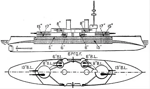 The Italian navy has shown greatest originality of design, though many of the ships have never been approved by other naval authorities. The Italians early grasped the fact that powerful vessels must be large and did not hesitate to accept great dimensions. Following the Dandolo and Duilio of nearly 12,000 tons, which have already been mentioned, they built the enormous nondescripts Italia and Lepanto of over 15,000 tons. These great vessels have no side armor whatever, but in a large diagonally placed barbette, 19 inches thick, are mounted four 17-inch guns weighing 100 tons each. These were followed by three vessels of about 11,200 tons, also carrying four 100-ton guns, but having the water line protected by armor for about half the length amidships. The Sicilia, Sardegna, and Re Umberto, of 13,300 to 13,900 tons, begun in 1884, were originally planned as improved Italias without side armor, but when completed more than half the whole side from water line to upper deck was covered with 4-inch plating as a defense against small-calibre rapid-firing guns, and they were the first vessels to be so protected. In the next designs the Italians adopted the 8-inch gun as an intermediate calibre, mounting it much as it is placed in American battleships. In their newest vessels the whole auxiliary battery is made up of 8-inch guns and the speed is put at 21.5 knots, at least 2.5 knots greater than that of any other battleships built or building.
