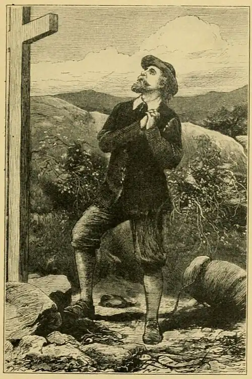 He ran thus till he came to a place somewhat ascending; and upon that place stood a Cross, and a little below, in the bottom, a tomb. So I saw in my dream, that just as Christian came up with the cross, his burden loosed from off his shoulders, and fell from off his back, and began to tumble, and so continued to do till it came to the mouth of the tomb, where it fell in, and I saw it no more.