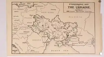 - ↑ The Ukraine ethnographically comprises the Governments of Kiev, Poltava, Podolia, Volhynia, Tchernigov, Ekaterinoslav, Kharkov, Kherson, Cholm, Eastern Galicia, Ukrainian Bukovina, Ukrainian Hungary, Ukrainian Bessarabia, and some districts of the Governments of Grodno, Minsk, Taurida, the Don, Kursk, Voronege, Kuban, Stravropol, and Tchernomore.