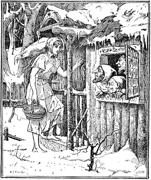 The girl was so obedient that she put on the paper dress and set out with her little basket. There was nothing but snow far and near, and not a green blade of grass to be seen anywhere. When she came to the wood she saw a little house, and out of it peeped three little dwarfs. She wished them good-day, and knocked modestly at the door. They called out to her to enter, so she stepped in and sat down on a seat by the fire, wishing to warm herself and eat her breakfast. The Dwarfs said at once: ‘Give us some of your food!’