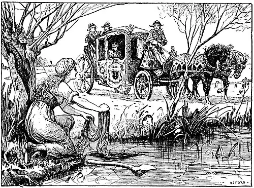 ‘I am only a poor girl,’ she answered, ‘and am rinsing out my yarn in the river.’ Then the King was sorry for her, and when he saw how beautiful she was he said: