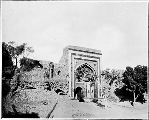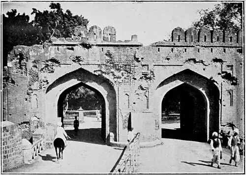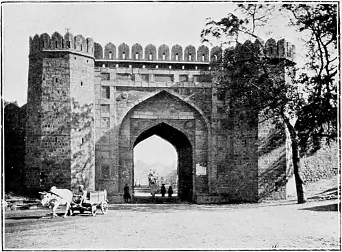 The enemy's artillery being placed in batteries soon made numerous breaches in the shaky old walls; his point of attack was the tower at the south-east angle, then called the "Nila Burj," now improved into the Wellesley Bastion. The rotten wall came down in large masses, and a breach was formed nearly a hundred yards long, but an earthwork was made in rear, and was repaired as fast as it was damaged by the heavy fire. An attempt to storm was repulsed, and gradually the defences at this point were made so strong as to relieve anxiety. A successful sortie against the enemy's batteries, on the night of the 10th of October, made him turn his eyes to another point of attack. The Ajmere Gate, and the curtain between that gate and the Turkmān Gate, were now bombarded, but similar measures of defence resisted all attempts to enter the city; after a final assault on the 14th, the Mahrattas retired towards Rewari, three days before the commander-in-chief, with a relieving force from Agra, reached Delhi. Had the enemy attacked at several points simultaneously in the long enceinte the place must have fallen; but that does not detract from this most gallant defence.