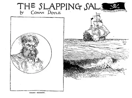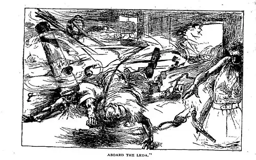 But the "Leda" lay sorely stricken, with her mainmast gone, her bulwarks shattered, her mizzen topmast and gaff shot away, her sails like a beggar's rags, and a huudred of her crew dead and wounded. Close beside her a mass of wreckage floated upon the waves. It was the stern post of a mangled vessel, and across it, in white letters on a black ground, was printed "The Slapping Sal."