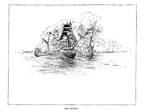 But that shouting hundred could not claim it all as their own. As the smoke cleared, it was not difficult to see the reason. The ships had gained the mouth of the estuary during the fight, and there, about four miles out to sea, was the "Leda's" consort bearing down under full sail to the sound of the guns. Captain de Milon had done his part for one day, and presently the "Gloire" was drawing off swiftly to the north, while the "Dido" was bowling along at her skirts, rattling away with her bowchasers, until a headland hid them both from view.