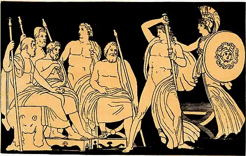 Then Achilles was mad with anger, and he thought in his heart, "Shall I arise and slay this caitiff, or shall I keep down the wrath in my breast?" And as he thought he laid his hand on his sword-hilt, and had half drawn his sword from the scabbard, when lo! the goddess Athené stood behind him (for Hera, who loved both this chieftain and that, had sent her), and caught him by the long locks of his yellow hair. But Achilles marvelled much to feel the mighty grasp, and turned, and looked, and knew the goddess, but no one else in the assembly might see her. Terrible was the flash of his eyes as he cried: "Art thou come, child of Zeus, to see the insolence of Agamemnon? Of a truth, I think that he will perish for his folly."
