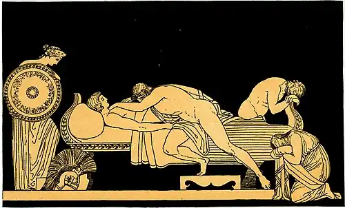 Meanwhile in the camp of the Greeks they mourned for Patroclus. And Achilles stood among his Myrmidons and said:—