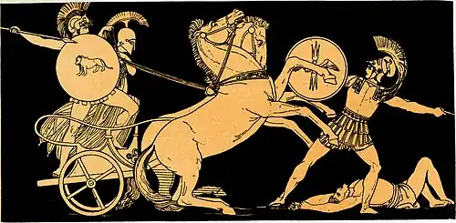 "Nay," said Æneas, "talk not thus. Climb into my chariot, and see what horses we have in Troy. They will carry us safe to the city, even should Diomed prevail against us. But take the rein and the whip, and I will fight; or, if thou wilt, fight thou, and I will drive."