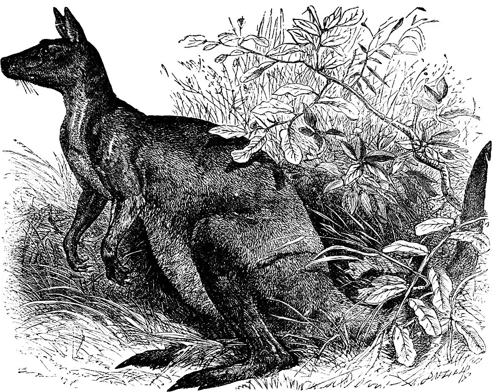 The extraordinary appearance of this creature surprised us very much. It was as large as a sheep, its head was shaped like that of a mouse; its skin also was of a mouse-colour, it had long ears like a hare, and a tail like a tiger's. The fore-paws resembled those of a squirrel, but they seemed only half-grown, while the hind-legs were enormous, and so long, that when upright on them the animal would look as if mounted on stilts.