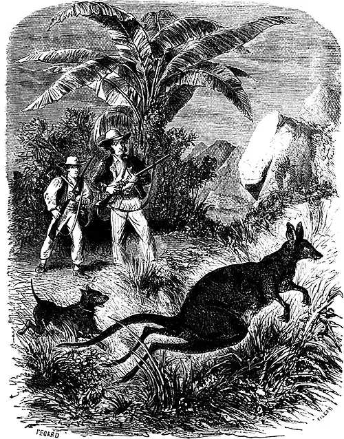 “The jerboa!” I exclaimed, “the jerboa! now we shall have it. This is really very like a jerboa, only far larger. It must be a kangaroo, one of the class of animals which has a pouch or purse beneath the body, in which its young can take refuge. They were discovered in New Holland, by the great Captain Cook, and I congratulate you on being the first to obtain a specimen in New Switzerland!” I added, laughing, as I extemporized the name.