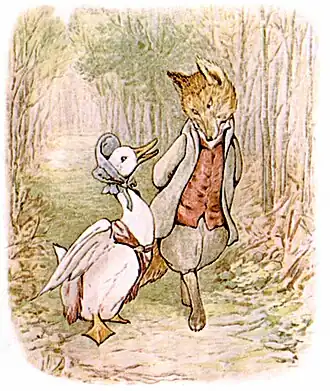 JEMIMA PUDDLE-DUCK came every afternoon; she laid nine eggs in the nest. They were greeny white and very large. The foxy gentleman admired them immensely. He used to turn them over and count them when Jemima was not there.