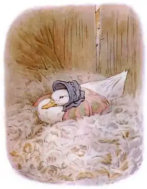 Jemima Puddle-duck was rather surprised to find such a vast quantity of feathers. But it was very comfortable; and she made a nest without any trouble at all.