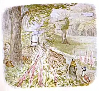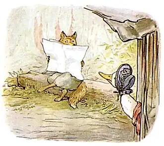 She flew over the wood, and alighted opposite the house of the bushy long-tailed gentleman.