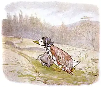 JEMIMA PUDDLE-DUCK was not much in the habit of flying. She ran downhill a few yards flapping her shawl, and then she jumped off into the air.