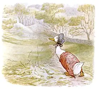 JEMIMA PUDDLE-DUCK went up the cart-road for the last time, on a sunny afternoon. She was rather burdened with bunches of herbs and two onions in a bag.
