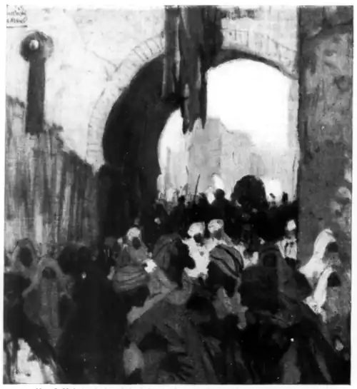 Gouthia ran to the balcony. She looked through the lattice; and a few moments later she was downstairs, unveiled, followed by el-Fosiha. She pushed through the crowd and threw herself across the dusty, bleeding, moaning mass. “O my beloved!” she cried. “O thou, my soul! O thou, my hero!” She took Hassan's battered face in her hands; kissed the bruised lips passionately. There was a pause; and then, in an agony of love and pain: “What have they done to thee, beloved? Allah! What have they done to thee—?”