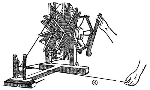 The reel noticed in the diagram between the drum and the handle is composed of a wooden disc marked 9 made out of 1 inch thick and 6 inches square piece of wood. Six brackets made of galvanized wire of 10 gauge radiate from the centre of the disc so as to make a circumference of 4 feet. The brackets are fixed in the back of the disc with bent ends and are further secured with small nails near the circumference of the disc.