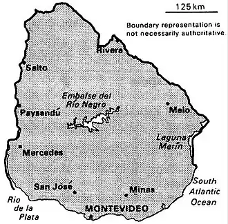 Administrative divisions: 19 departments (departamentos, singular—departamento); Artigas, Canelones, Cerro Largo, Colonia, Durazno, Flores, Florida, Lavalleja, Maldonado, Montevideo, Paysandú, Río Negro, Rivera, Rocha, Salto, San José, Soriano, Tacuarembó, Treinta y Tres
