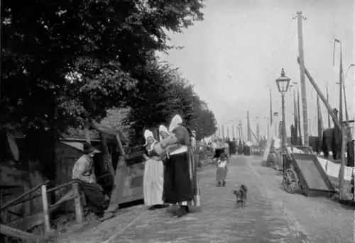 The lad is calling attention to his valuable silver “breech-pieces.” The girl is wearing the Volendam cap with its stiffly starched cornettes.