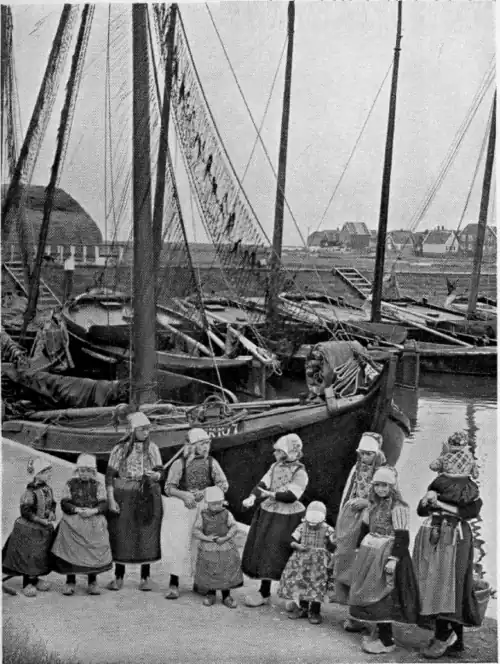 Girls, wearing a many-coloured costume, are waiting for the tourist. The town is one of the “show-places” of Holland.