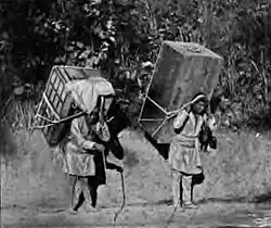 On my journeys to and back from Nepal I took great interest in the innumerable carriers I passed, from, I suppose, a purely athletic point of view, but I measured roughly, having large experience, many of the loads (a picture of two is shown overleaf), and found that the amount carried was often from 800 to 400 lbs. in weight.