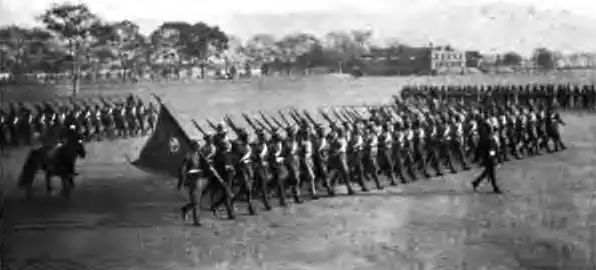 It is a curious army, probably the most remarkable of its kind in the world. It is continually being drilled in archaic manoeuvres, which, with the exception of the battalion marching movements, it always executes rather badly. But when the battalions are on the move, marching either in masses or as on the line of route, they perform very well. The men are physically excellent, though badly set up and equipped archaically, and armed with what apparently is the old Brown Bess — very old indeed, and apparently never cleaned; yet the regiments have many of them historic names, have an excellent pride in themselves, and an excellent esprit de corps; in fact, the army is an army, in my opinion, and only requires a modern standard of training and arms to be a most formidable force. It is in all senses a regular army, by which I mean an army with national ideals and a sense of responsibility.