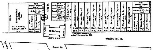 Before retiring to his farm, Dongan (in 1689) sold the greater part of the property he had acquired in Wall Street to Abraham De Peyster, and Nicholas Bayard. A scrap of curious history is told in connection with this property. The southerly line of the street had been laid through the sheep walk, and drawn with reference to a proper field of military manœuvre, one hundred feet from the wall. A city street of that width was considered unnecessary. Hence a little shrewd speculation. Dongan purchased of the heirs of the Damen estate, eighty feet in depth along the line of the ditch, across the whole southern front of their property. To this he added some forty-five feet from the vacant land to the south of the ditch, and thus made lots of about one hundred and twenty-five feet in depth, along the southern edge of which he fixed the northern line of Wall Street. This was in 1685, at which time the street was surveyed and ordered to be established.