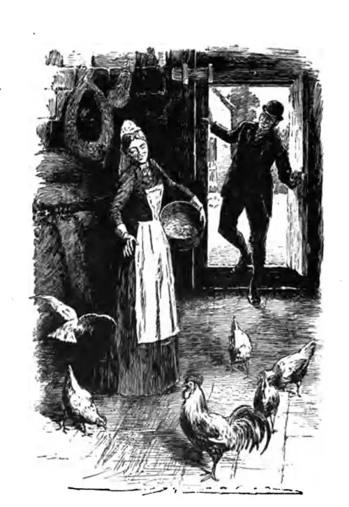 The barn had two doors, that at which Hepworth stood, Opening from the fold, and one, exactly opposite, which gave access to the orchard. Between these doors the floor-space was covered with boards that in former days had been used as a threshing-floor. In the centre of this stood Elisabeth. She was dressed for the afternoon in a neat black dress, relieved from any suspicion of sombreness by a white muslin apron and cap. In one hand she held a measure full of grain, and she threw handfuls of this to the fowls which had followed her into the barn and now grouped themselves, feeding and clucking, at her feet. Now and then she threw a handful with wider sweep to the pigeons who strutted at the entrance to the orchard, or to the sparrows that had flown down from the bare-branched apple-trees and came timidly towards the barn-door. As she thus occupied herself she sang, but after he had caught sight of her Hepworth was not so much interested in her singing as in her face. For the first time since he had seen it the expression of grief and sorrow was gone and in its place there was life and animation. Elisabeth's cheeks were full of colour; her eyes danced with pleasure, smiles curved her lips as she flung the grain amongst the birds at her feet: Hepworth suddenly recognised that she was a pretty and even fascinating woman. He pushed open the door and advanced into the barn: Elisabeth turned and caught sight of him. She stopped singing, and at the same moment the pigeons and sparrows, frightened by Hepworth's entrance, flew away above the trees outside. The fowls stayed there and pecked at the stray grains with undisturbed industry. Elisabeth gave a little laugh and flung the grain which remained in the measure amongst them in a heap.