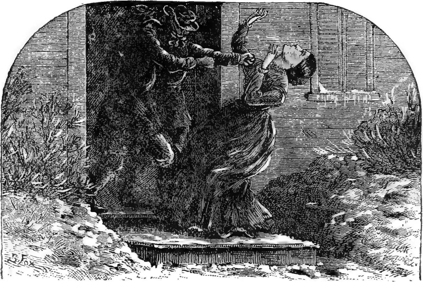 "In the mean time Betsey and I were undressing the children; and hearing sounds of heavy footsteps and muttering undertones of strange voices and persons struggling in the passage, we looked at each other, and rushed to the door, each with a child in our arms. I succeeded in pulling open the room door in the passage, but I had no sooner done so than a man who was holding the door knocked me back into the room, flat upon the floor, with the baby in my arms, and, shutting the door again, held it fast. Instantly I laid the baby on the carpet, and, with all my strength, forced open the door, and found myself surrounded by a number of ruffians, — I believe five or six, — who were all in the dark, for they had extinguished the candle, and I calling aloud for Mr. several minutes. In the end he, gasping for breath, answered me.