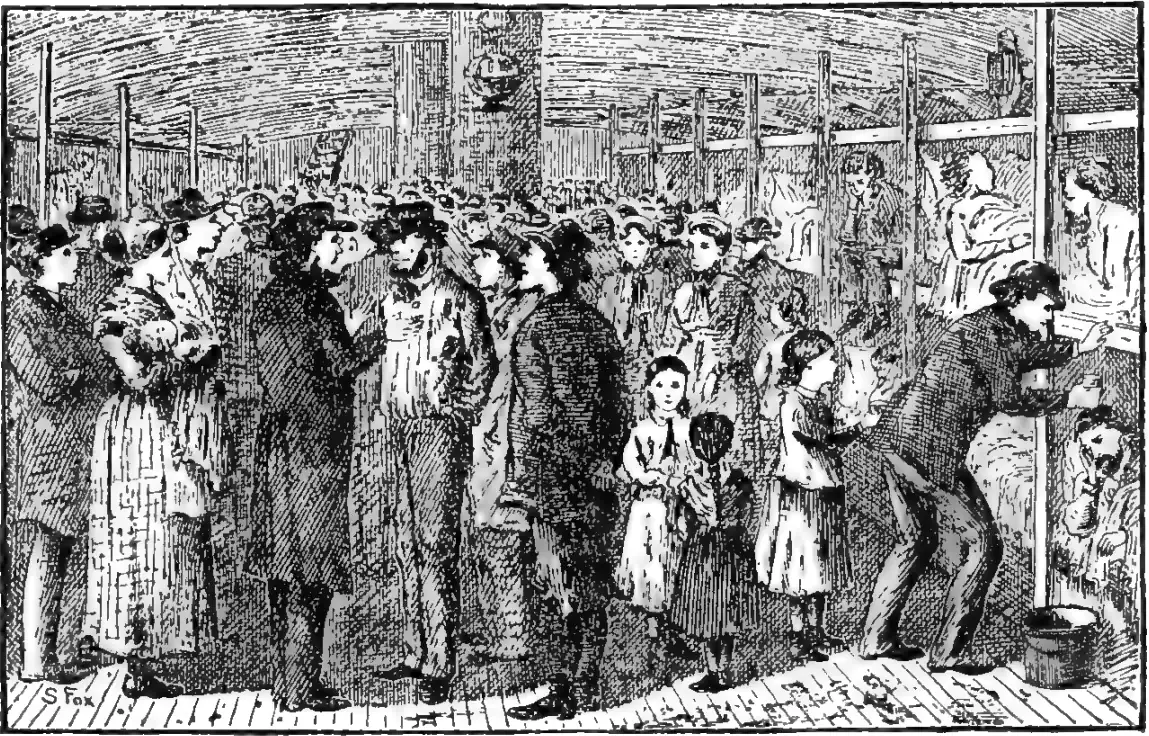 the emigrants, say that it was like nothing so much as an African slave-ship, filled with its unlawful and ill-gotten freight. The air in the steerage, where most of the emigrants were, was noxious, and yet these people were compelled to breathe it through all the days of the voyage. Many were too ill to leave their beds, and a change of clothing was out of the question. The entire floor was covered with mattresses, and it was impossible to walk about without stepping over some one. Men, women, and children were huddled in together in the most shameless fashion.