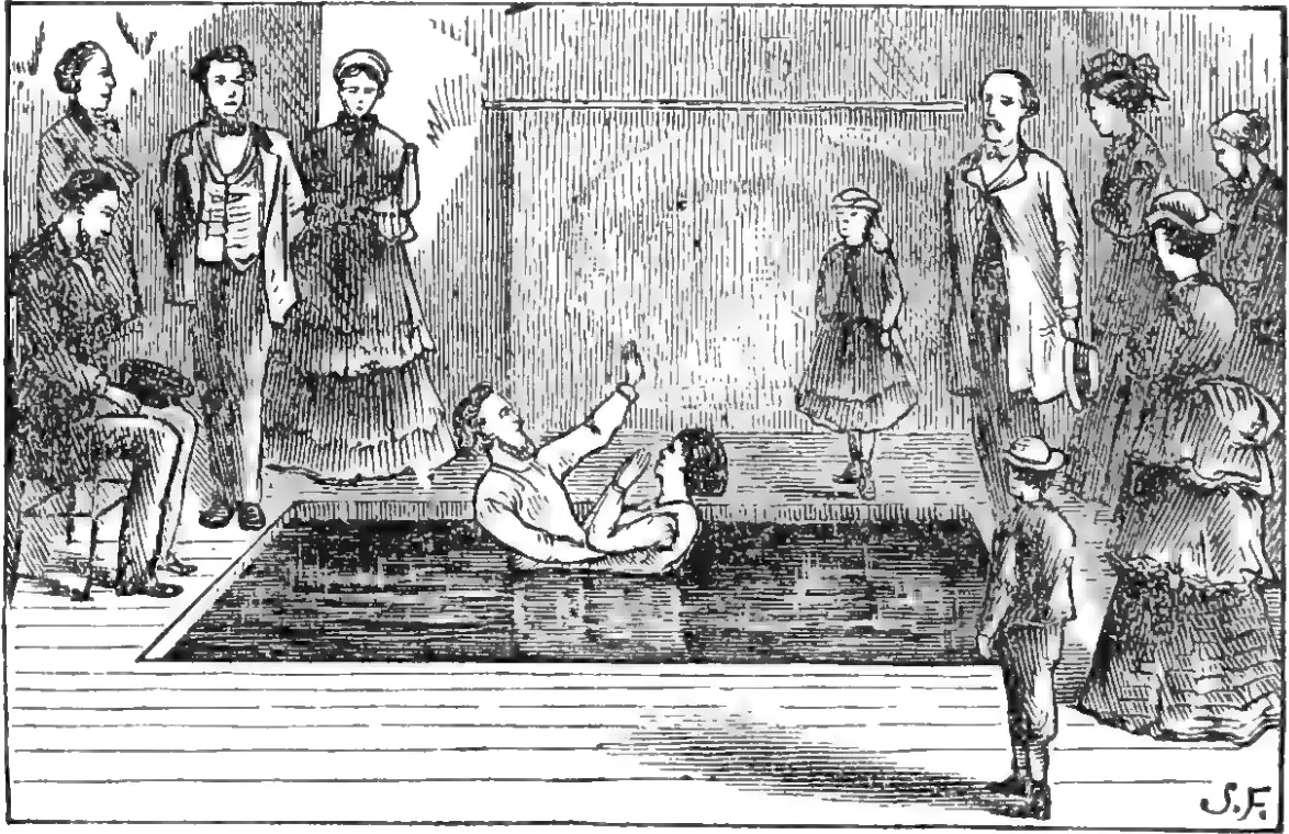We entered a large bath-room, which was separated in the middle by a heavy curtain, for the purpose of dividing the men from the women. The men passed to one side of the curtain, the women to the other. In our room were several large tubs filled with water, and Miss Eliza R. Snow and two or three other women were in attendance. I was received by Miss Snow, who placed me in one of the tubs, and washed me from my head to my feet, repeating certain formulæ to the effect that I was washed clean from the blood of this generation, and if I remained firm in the faith, should never be harmed by any of the ills that beset the world, and which soon were to be showered in terrible profusion upon the earth. Plagues, pestilence and famine should cover the earth, and be let loose in its every corner, but I should be passed by unscathed, if I was true to my religion — the only revealed religion of God. After I had been wiped dry, she proceeded to anoint me with olive-oil. As she did so, she repeated, solemnly, —