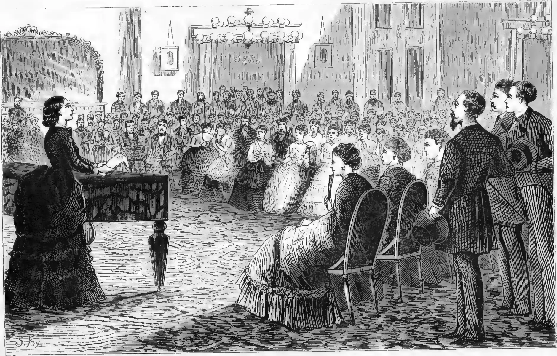My forebodings had been utterly useless. Long before the church doors were opened a large crowd was in waiting, and before the hour for beginning the lecture arrived the house was full, and hundreds had gone away unable to gain admission. As I looked into the crowded house, before I came on the platform, my courage almost left me. But while hesitating, the thought of the poor women whose cause I was to plead, came vividly into my mind, and with a firm step, and beating heart, I walked onto the platform, and stood facing my first audience, who greeted me with tumultuous applause.