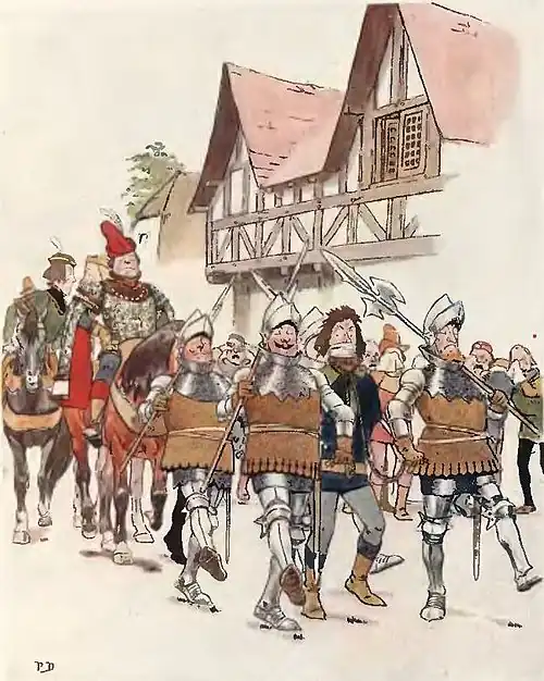 The soldiers tied Tell's hands. He offered no resistance. And amidst the groans of the people he was led away to the shore of the lake, where Gessler's ship lay at anchor.