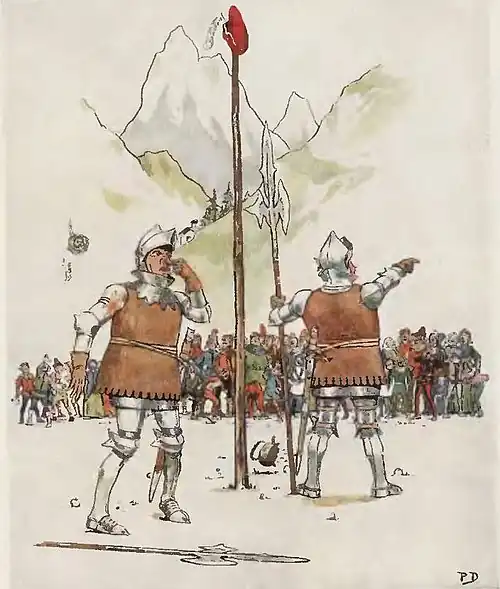 Tell was very patriotic. He always believed that some day the Swiss would rise and rebel against the tyranny of the Governor, and he used to drill his two children so as to keep them always in a state of preparation. They would march about, beating tin cans and shouting, and altogether enjoying themselves immensely, though Hedwig, who did not like noise, and wanted Walter and William to help her with the housework, made frequent complaints. “Mark my words,” she would say, “this growing spirit of militarism in the young and foolish will lead to no good,” meaning that boys who played at soldiers instead of helping their mother to dust the chairs and scrub the kitchen floor would in all probability come to a bad end. But Tell would say, “Who hopes to fight his way through life must be prepared to wield arms. Carry on, my boys!” And they carried on. It was to this man that the Swiss people had determined to come for help.