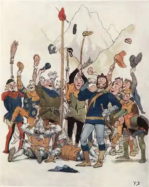 Having set up the pole and cap in the meadow, Gessler sent two of his bodyguard, Friesshardt (I should think you would be safe in pronouncing this Freeze-hard, but you had better ask somebody who knows) and Leuthold, to keep watch there all day, and see that nobody passed by without kneeling down before the pole and taking off his hat to it.