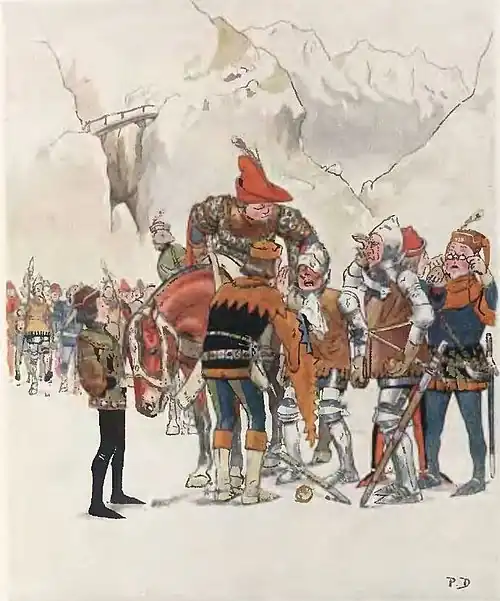 “You've hurt my head very much,” said Tell. “Feel the bump. If I hadn’t happened to have a particularly hard head I don't know what might not have happened;” and he raised his fist and hit Friesshardt; but as Friesshardt was wearing a thick iron helmet the blow did not hurt him very much.