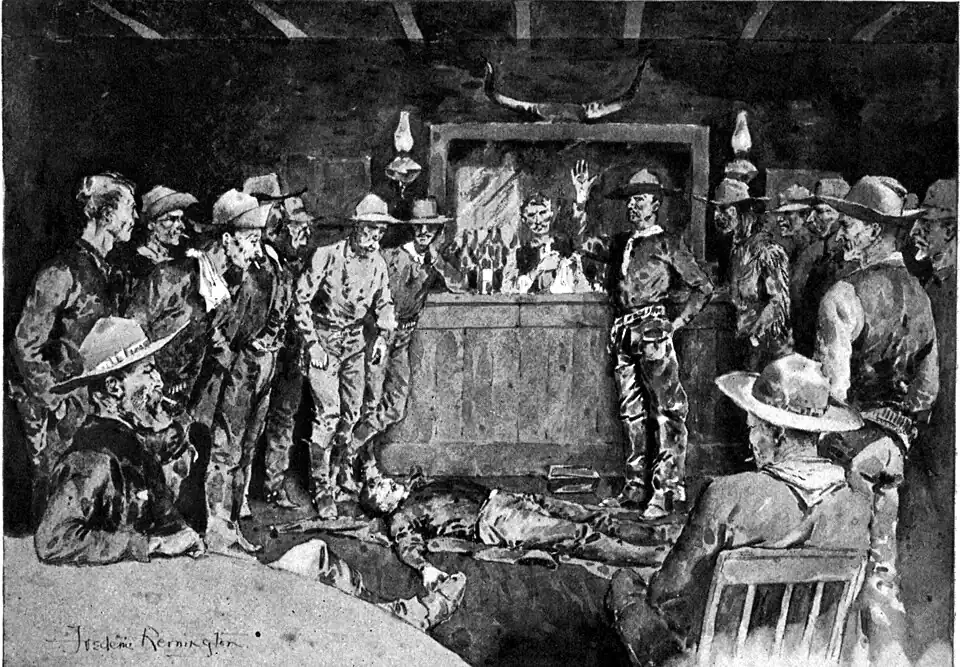 "As soon as it gets blown through Wolfville this Yallerhouse party has smallpox, everybody comes canterin' over to the Red Light, gets a drink, an' wants to hold a mass meetin' over it. By partic'lar request Enright takes the chair an' calls 'em to order.