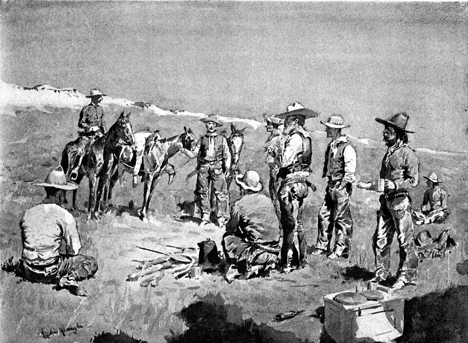 "The way this yere Jaybird manages to stampede the bunch that time is this a-way. Jaybird comes ridin' in from the cattle about three hours before sun-up, to turn out Tutt, who is due to take his place on herd. Jaybird's got a rawhide rope that he's drugged about in the grass, which makes it damp an' cold. As Jaybird rides up to camp he sees this Todd rolled in his blankets, snorin' to beat four of a kind.