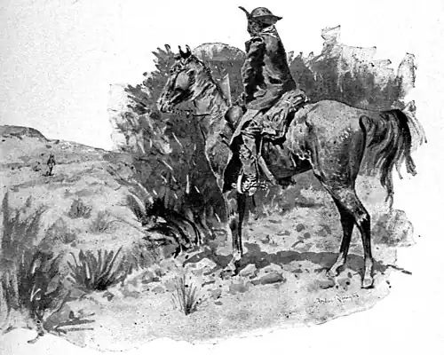 "'Which it can't be said I don't make runnin' of it, however; I don't reckon now it's mor'n an hour before I knows all Taos, bar Mexicans an' what some folks calls "the better elements." It also follows, like its lariat does a loose pony, that I'm some organized by whiskey, not to say confused.