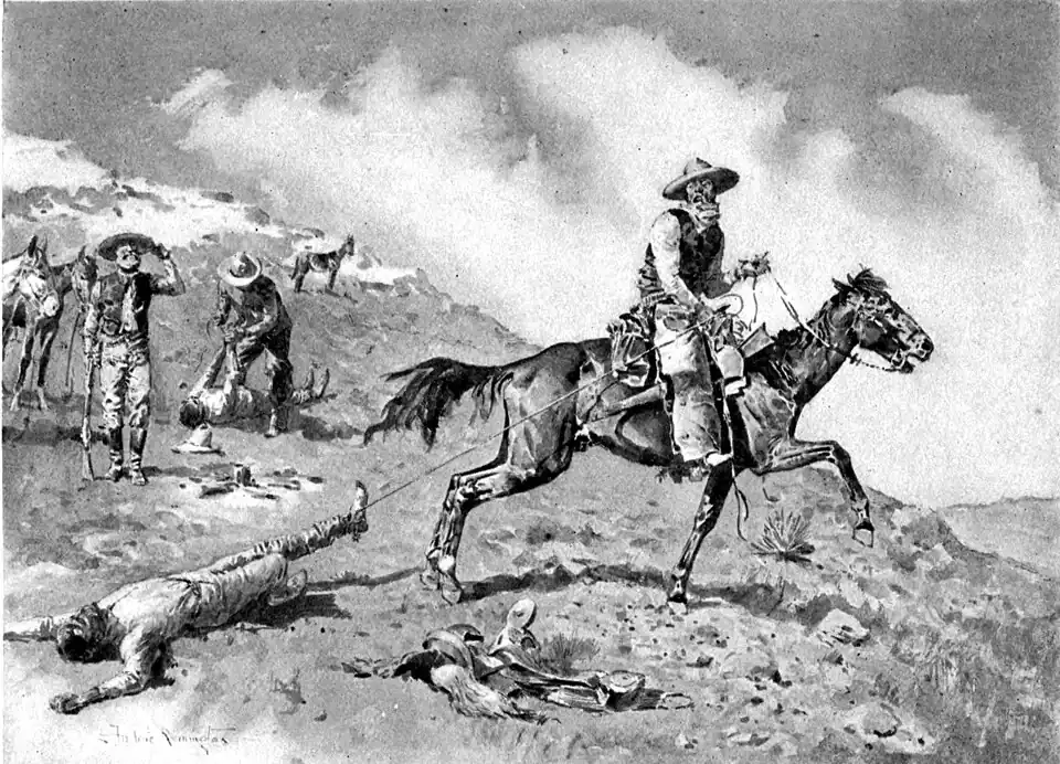 "Jack Moore drops the loop of his lariat over the off moccasin of the deceased Mexican, an' canters his pony down the draw with him, so's we ain't offended none by the vision of him spraddled out that a-way dead. This yere's thoughtful of Jack, an' shows he's nacherally refined an' objects to remainders lyin' 'round loose.